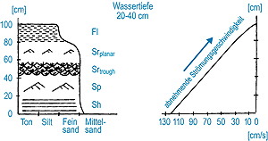 Abb. 9: Schema-Skizze einer Schilfsandstein-Bank am „Märchensee“; die vollständige Abfolge der Sedimentstrukturen ist nur z.T. verwirklicht: Unten Horizontalschichtung (Sh; Übergangsbereich oberes/unteres Strömungsregime) – größere Rippeln (Sp; ab jetzt unteres Strömungsregime) – kleindimensionale gebogene (Srtrough) und gestreckte Rippeln (Srplanar) – obere horizontale Feinschichtung (F). Die Strömungsgeschwindigkeit bei der Ablagerung nimmt nach oben ab (rechte Skizze). Oben mutmaßliche Wassertiefe beim Sedimenttransport; weitere Erläuterungen im Text. (Nach AIGNER & ETZOLD 1999)