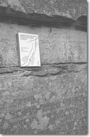 Schrägliegende Feinschichtung. Es kommen aber auch im horizontalgeschichteten Bereich schräggeschichtete Partien vor; sie sind aber anders ausgebildet als die bekannten Schrägschichtungskörper. In Abb. 4 wurden im unteren Bereich die horizontalen Sandlaminae (Feinschichten aus Sand) durch eine schräggeschichtete Partie abgeschnitten (erodiert). In der Bildmitte ist deutlich erkennbar, daß die horizontalen Feinschichten nach rechts unten abbiegen (Unterschied zu geläufiger Schrägschichtung). Etwa 20 cm weiter oben geht die schräggeschichtete Partie langsam wieder in horizontale Feinschichten über. „Unorganisierte Einschaltungen schräggeschich teter Sande in die horizontallaminierte Abfolge“ werden z.B. aus dem Mittleren Buntsandstein (Untere Trias) von Oberfranken beschrieben. Sie belegen nach MADER (1985) Schwankungen des Energieniveaus mit wechselnder Stabilität der einzelnen Stadien. Im Buntsandstein handelt es sich nach MADER um „episodische und kurzfristige Phasen des hochenergetischen unteren Fließregimes“, die in das noch höherenergetische obere Strömungsregime eingeschaltet sind (189f.). GEHRMANN & AIGNER (2002, 385) beschreiben aus dem Schilfsandstein (Obere Trias) am Jägerhaus bei Heilbronn „horizontal geschichtete Bereiche mit ... Übergang in flach schräg geschichtete Bereiche“. Sie scheinen dies jedoch umgekehrt (!) zu interpretieren, als „Bildung beim Übergang von strömendem zu schießendem Wasser bei Tiefen <0,5 m und Strömungsgeschwindigkeiten um 1 m/sec.“