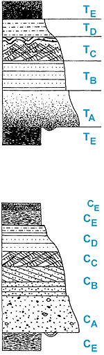 Abb. 8: Vollständige Abfolge eines Trübestroms (Turbidit): Unten die gröbsten Sedimente (A). Darüber horizontal-geschichteter (laminierter) Sand (B); diese beiden Schichtglieder entstehen im schießenden Wasser. Die darauffolgende Schrägschichtung und Rippelschichtung (C) erfolgt im niedrigerenergetischen strömenden Wasser. Darüber langsamer abgelagerte laminierte feinkörnige Sedimente (Lutite), die obere Horizontalschichtung (D). Breitet sich heute der Trübestrom auf dem Tiefseeboden aus, dann setzt sich darüber zuletzt sehr langsam Ton als pelagisches (Hochsee) Sediment ab (E). (Nach Reineck 1984)