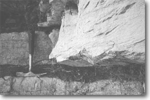 Abb. 4: In der Bildmitte biegt die Horizontalschichtung schräg nach unten ab; der untere Teil der Horizontalschichtung wurde rechts wieder abgetragen (erodiert). Darüber lagern sich schrägliegende Feinschichten ab; weitere Erläuterungen im Text (Strömung von links)