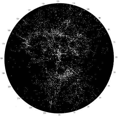 Abb. 1: Darstellung unserer kosmischen Umgebung aus der Sicht eines virtuellen Beobachters, in einer Entfernung von einigen Milliarden Lichtjahren senkrecht zur Ebene unserer Milchstraße. Auffallend sind u. a. die sog. „Finger Gottes“: Galaxien scheinen in speichenartiger Form auf uns in die Mitte zu weisen.