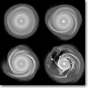Abb. 2: Simulierte Verwirbelung in einer protoplanetaren Scheibe (Mayer et al. 2002). Bereits nach wenigen Umdrehungen bilden sich spiralförmige Arme aus, die dann fragmentieren und Planetenkörper bilden. Die Gas-Staub-Scheibe ist etwa 20 Erd-Sonne-Abstände groß.