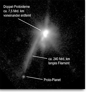 Abb. 3: Erstes Bild eines extrasolaren Planeten bzw. was man dafür hält: Das Hubble-Weltraumteleskop hat ein Objekt fotografiert, das am Ende eines Lichtfilaments zu sehen ist. Offensichtlich ist es aus dem Doppelsternsystem im Sternbild Stier herauskatapultiert worden. (TMR-1C, HST)