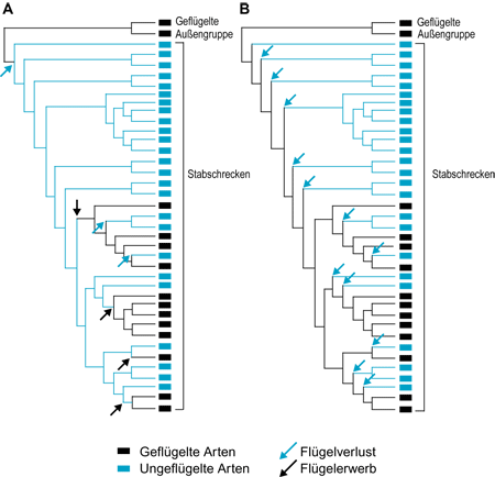 Abb. 2: Links: Dendrogramm der Stabschrecken nach Whiting et al. (2003), wonach ein dreifacher Flügelverlust (blaue Pfeile) und eine vierfache Re-Evolution (schwarze Pfeile) der Flügel erfolgte. Dieses Dendrogramm ist das „sparsamste“, d. h. es kommt mit den wenigsten Evolutionsschritten aus (Näherers im Text). Rechts: Nach einer alternativen Hypothese, wonach eine Re-Evolution der Flügel ausgeschlossen wird, müßte ein 13-facher Verlust der Flügel und damit mehr Evolutionsschritte angenommen werden (nach Stone & French 2003).