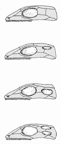 Abb. 2: Verschiedene Typen des Schläfenfensters bei Reptilien. Der Typ des Schläfenfensters dient zur Klassifikation. (Nach Romer & Parsons 1991)