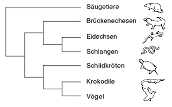 Abb. 3: Alternative Hypothesen zur Stellung der Schildkröten innerhalb der heute lebenden Amnioten. Näheres im Text. (Nach Zardoya & Meyer 2001)