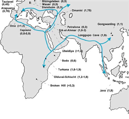 Abb 1: Die geographische und geologisch-zeitliche Verteilung der wichtigsten Fundorte fossiler Formen der Gattung Homo. Die Pfeile geben mögliche Ausbreitungsrichtungen an. Die zeitliche und geographische Verteilung dieser Homo-Arten ist unterschiedlich gut verträglich mit den drei grundsätzlich verschiedenen Modellen zur Evolution des Homo sapiens (siehe 1. Kasten).