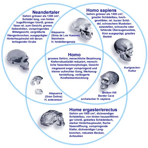 Abb. 2: Die drei morphologischen Hauptgruppen des Menschen und die mittelpleistozänen Mischformen mit den jeweils charakteristischen Merkmalen. Funde und Arten, die spezielle Merkmale von zwei (oder sogar drei) Gruppen in sich vereinigen, sind in den entsprechenden Überlappungszonen anzusiedeln. Homo antecessor weist Merkmale aller drei Hauptgruppen auf; in der Abbildung ist dies nicht genau darstellbar. (Nach JUNKER & SCHERER 2001; nach STRINGER)
