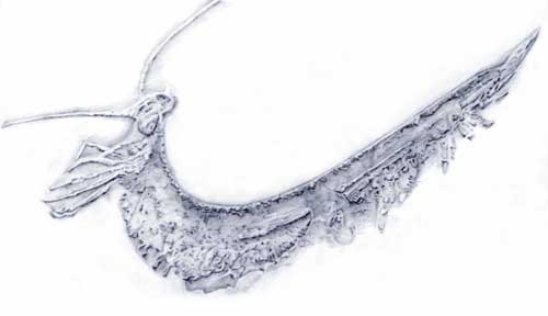 Abb. 2: Arthropode (Gliederfüßer) aus dem Hunsrückschiefer (Unterdevon) von Bundenbach, der vorläufig als „Devon-Hexapode“ bezeichnet wurde. Es soll sich um einen Vorläufer der Insekten handeln (s. jedoch Text). (Zeichnung: Marion BERNHARD, nach BECHLY et al. 2001)