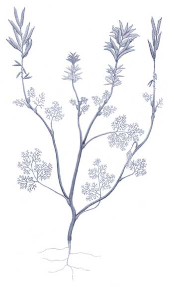 Abb. 1: Rekonstruktion von Archaefructus sinensis aus der Yixian-Formation im Nordosten Chinas, angenommes Alter 124-140 Millionen Jahre. Diagramm von SIMONS & DILCHER aus SUN et al. (2002). Man erkennt das für untergetaucht lebende Wasserpflanzen typische schwach entwickelte Wurzelsystem und stark zerteilte Blätter. Die Blüten zeigen an langer Achse stehend zuerst gestielte Staubblätter mit je zwei Staubbeuteln und nach oben anschließend zahlreiche Fruchtblätter mit jeweils mehreren Samenanlagen. Eine Blütenhülle fehlt. (© D. L. Dilcher, Abdruck mit freundlicher Genehmigung)