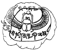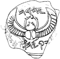 Abb. 1: Siegel mit der Inschrift „Eigentum Hiskias [des Sohnes] Ahas, König von Juda“. Das Piktogramm zeigt einen geflügelten Skarabäus.