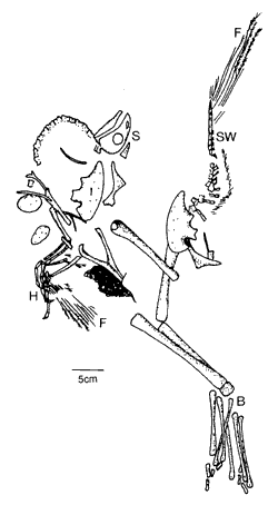 Abb. 1: Skizze des fossilen Theropoden Caudipterxyx. S Schädel, SW Schwanzwirbelsäule, H Handskelett, B Beinskelett, F Federn (Nach JI et al. 1998)