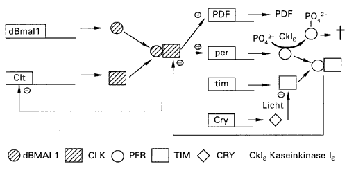 Jedenfalls sind 24-Stunden-periodische Änderungen der Aktivität von Drosophila erkennbar, sowie Schwanken von Genexpression, Hormonsekretion oder anderer physiologischer Parameter, die auch bei Tierhaltung in konstanter Dunkelheit ohne äußere Zeitgeber erhalten bleiben. Die Folgerung, es gebe eine interne Uhr bei Drosophila, ist also offensichtlich. In den letzten Jahren wurden die Komponenten und die Funktion dieser inneren Uhr von Drosophila aufgeklärt (Abb. 1).