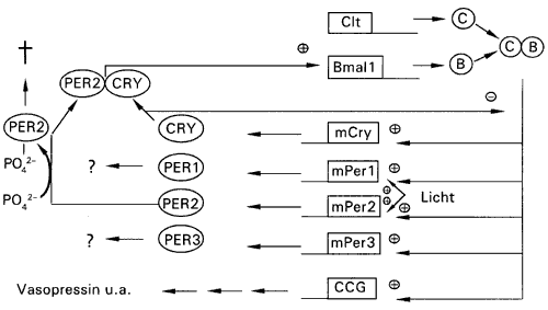 Zu Beginn eines Zyklus (am Morgen) steht die Herstellung des mBmal1-Genes (Abb. 2). Das Protein BMAL1 verbindet sich dann mit CLOCK, das ständig hergestellt wird. Der Komplex BMAL1/CLOCK gelangt in den Zellkern und aktiviert drei period-Gene mPer1, mPer2, mPer3, zwei cryptochrom-Gene mCry1 und mCry2 und die clock-controlled-Gene (ccg).