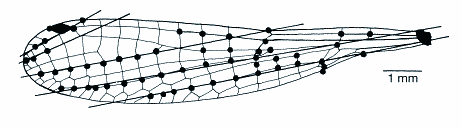 Abb. 1: Flügeladerung einer Becher-Azurjungfer (Enallagma cyathigerum). Die Resilin-Mikrogelenke sind markiert. Die eingezeichneten Linien deuten die Achsen an, auf welchen diese etwa angeordnet sind. Beim Flügelschlag kann sich der Flügel entlang dieser Achsen elastisch verformen. (Nach Gorb et al. 2000)