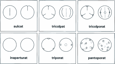 Abb. 1: Einteilung der Pollenkörner nach Art und Lage der Keimfalten = Keimfurchen und Keimporen (Auswahl). Links Polansicht, rechts Äquatoransicht. (Nach Strasburger 1998)