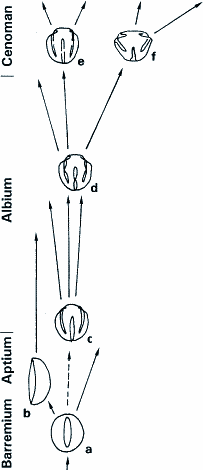 Abb. 2: Abfolge von Pollentypen ältester Angiospermen von der Unterkreide bis zum Beginn der Oberkreide. a-b 1 Keimfalte, c 3 Keimfalten, d-f 3 Keimfalten mit Ansätzen zur Ausbildung von Keimporen. (Nach Doyle & Hickey aus Strasburger)