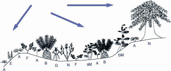 Paläoökologische Studien (Abb. 3) zeigen, daß die Angiospermen in der Unteren Kreide bevorzugt an Ufern von Flüssen und Seen wuchsen, und daß sie im deutlichen Gegensatz zu ihrer taxonomischen Diversität, d.h. hohen Artenzahl, selbst noch in der Oberen Kreide nicht dominierten, sondern oft nur Unterwuchs darstellten (Taylor & Hickey 1996, Wing et al. 1993).