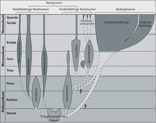 Abb. 6: Verbreitung der systematischen Gruppen der Samenpflanzen in den geologischen Schichten und mutmaßliche stammesgeschichtliche Zusammenhänge. (Nach Strasburger 1998, verändert)