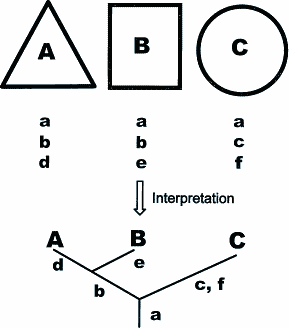 Abb. 1: Prinzipielle taxonomische und systematische Vorgehensweise bei drei hypothetischen Naturgegenständen. Für alle drei Kategorien ist a das basale Merkmal, für die beiden Kategorien A und B ist es b. Apikale Merkmale sind c-f.
