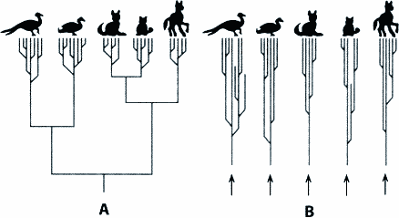 Abb. 4: Die beiden Konzepte zur Erklärung der Entstehung und Entwicklung des Lebens nebeneinander dargestellt. A Das evolutionistische Modell mit einem gemeinsamen alle Naturgegenstände verbindenden Stammbaum. B Das kreationistische Modell geht von distinkten Schöpfungskategorien aus, die in gewissen Grenzen evoluieren. Das theistisch-evolutionistische Modell ist von der Darstellungsweise identisch mit A, lediglich der Beginn ist ein Schöpfungsakt. (Aus Junker & Scherer 1998)