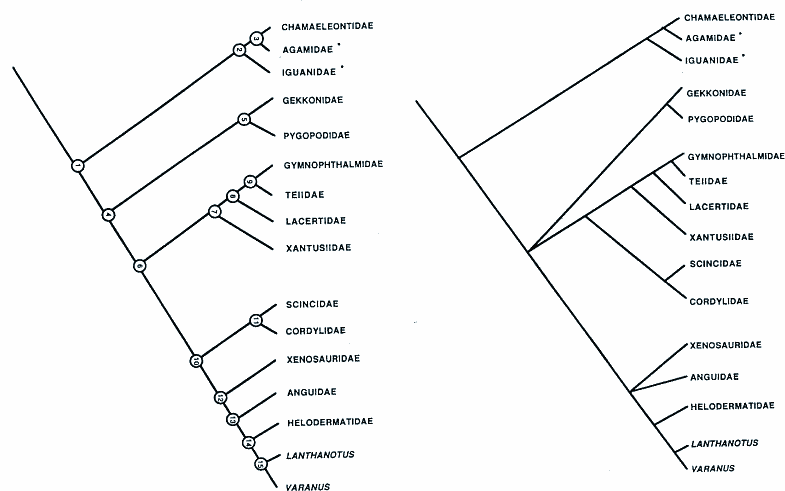 Abb. 5: Beispiele kladistischer Ordnungs-Schemata innerhalb der Eidechsen (Lacertilia), was jedoch als phylogenetischer Stammbaumentwurf publiziert wurde. (Aus Estes et al. 1988).
