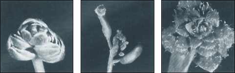 Abb. 2: Blütenmutanten der Acker-Schmalwand (Arabidopsis thaliana). Links: Blüte besteht nur aus Kelchblättern, Mitte: Blüte besteht nur aus Fruchtblättern (Stempel), rechts: Alle Blütenteile sind in laubblattarige Gebilde umgewandelt. (Aus Nature 353, © 1991 Macmillan Magazines Limited)