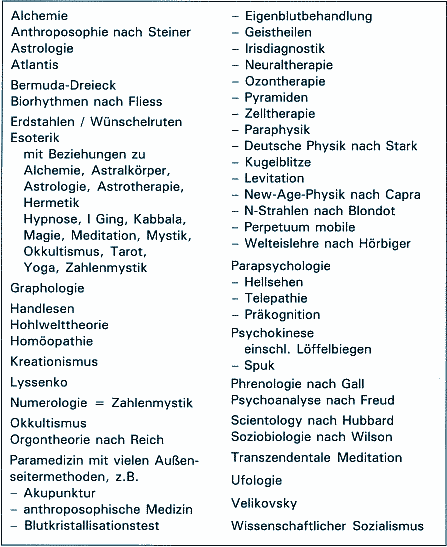 Tab. 1: Kandidaten fuer Pseudowissenschaften. (Nach Vollmer 1993, S. 15, leicht veraendert)