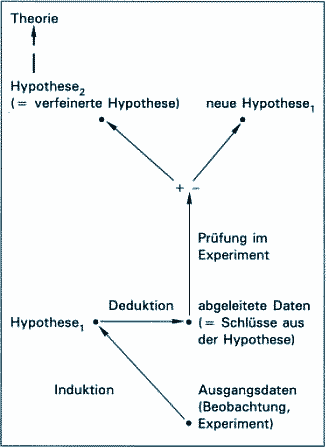 Jeder Erkenntnisgewinn baut auf Beobachtungsdaten auf, die mittels zuverlässiger Methoden gewonnen werden. Zuverlässig meint, daß die Beobachtungen jederzeit und unabhängig von der jeweils beobachtenden Person vorgenommen werden können. Und hinsichtlich der angewandten Methoden gilt, daß diese immer wieder kritisch hinterfragt werden müssen, ob sie als Handwerkszeug tauglich sind. Die so erworbenen Fakten werden dann in einer Hypothesenbildung berücksichtigt. Ziel der Forschung ist es ja, aus einer Fülle von Beobachtungen das Regelhafte herauszufinden, um die Welt um uns herum besser begreifen zu können. Diesen Vorgang, bei dem von den Einzelereignissen aus auf das Allgemeine geschlossen wird, nennt man Induktion. Die auf induktivem Weg gewonnenen und in einer Hypothese formulierten Erkenntnisse können nun angewendet werden. Aus ihnen heraus lassen sich weitere Daten ableiten. In diesem Prozeß der Deduktion werden Schlüsse aus der Hypothese gezogen, die vor dem erarbeiteten Hintergrund auch geprüft werden können. Häufig beginnt die wissenschaftliche Arbeit mit diesem Schritt, d. h. die Hypothese steht am Anfang und motiviert (und kanalisiert!) die Suche nach Daten und damit ihre Prüfung. Wenn die Überprüfung der Hypothese scheitert, muß sie verworfen werden, weil sie ihren Erklärungsanspruch nicht erfüllen kann. In diesem Fall muß eine neue Hypothese aufgestellt werden und der Prozeß beginnt von vorne. Besteht die Hypothese die Prüfung, wird dies als eine Bestätigung ihrer Inhalte gewertet. Sie kann dann für eine Theoriebildung weiterverwendet werden. Kleinere Unstimmigkeiten dienen üblicherweise als Hinweis auf eine vorläufige Unvollständigkeit. Die Forschung wäre dann in diesem Bereich zu intensivieren und die Hypothese dementsprechend zu modifizieren. Eine neuerliche Prüfung entscheidet später über ihre Bestätigung oder Verwerfung.