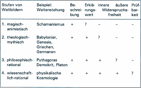 Tab. 2: Stufen von Weltbildern. In den weiteren Spalten sind Beispiele zur Weltentstehung angegeben und (vereinfachend) einige Kriterien, nach denen solche Weltbilder beurteilt werden koennen. (Nach Vollmer 1995, S. 7)