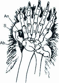 Abb. 1: Der Daumen des Panda. An Anziehmuskel, S radiales Sesambein, Ab Abziehmuskel. (Nach Gould 1989)
