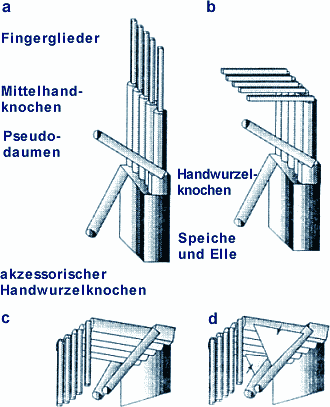 Eine "Extra-Extremität". Eine weitere Voraussetzung, die dem Panda-Prinzip zugrunde liegt, ist im evolutionstheoretischen Kontext ebenfalls fragwürdig, nämlich die Behauptung, es könnten nur vorhandene Strukturen umgebaut werden, so daß später Spuren dieses Umbaus erkennbar sind. Dies zeigt ein zum Gleitflug befähigtes ausgestorbenes Reptil (Coelurosauravus jaekeli), dessen vollständiges Skelett vor ein paar Jahren entdeckt worden ist. Es besaß einen Gleitschirm, dessen Gerüst nicht wie bei anderen zum Gleitflug und aktiven Fliegen befähigten Wirbeltiere die übliche Modifikation des Extremitätenbauplans der Landwirbeltiere aufwies. Das Gerüst bestand auch nicht aus umgebildeten Rippen oder anderen sonst bereits vorhandenen Elementen des Skeletts; auch handelte es sich nicht um ein Duplikat der Extremitäten. Vielmehr stellte der Flügel eine komplette Neukonstruktion dar (Frey et al. 1997; Abb. 3). Die seitlich ansitzende Gleitmembran wurde durch radial angeordnete, stark verlängerte hohle Knochenstäbe von dermalem (Haut) Ursprung gestützt, also nicht durch innere Knochen. Die Stützstäbe waren nicht mit dem Brustkorb verbunden.