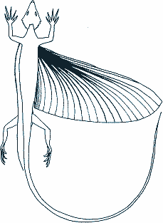 Abb. 3: Der Gleitflieger Coelurosauravus jaekeli, dessen Gleitmembran durch hohle Knochenstäbe von dermalem (Haut) Ursprung gestützt wurde. (Nach Frey et al. 1997)