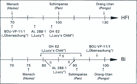 Kombiniert man trotz der genannten Unsicherheit Schädel- mit Extremitätenknochen, ergibt sich ein Wesen mit einem kleinen Gehirnvolumen, einem afarensis-ähnlichen "primitiven" Gesicht mit großen Zähnen, die die der robusten Australopithecinen in der Robustizität sogar noch übertreffen, einer relativ großen Statur und außerordentlich eigenartigen Extremitätenproportionen. Diese Proportionen, die mit Hilfe von einfachen Längen-Indizes quantifiziert werden können, enthüllen eine überraschende Eigenschaft (Abb. 3): wie der Orang-Utan besitzt das Teilskelett besonders lange Unterarme, erkenntlich am hohen Brachialindex (BI), was sie zum Hangeln befähigte. Die Arm-Bein-Proportionen entsprechen dagegen ganz denen des Menschen. Sollten hier Merkmale eines Schwinghanglers mit dem eines Zweibeiners kombiniert sein? Unabhängig davon, ob dieses Teilskelett zu A. garhi gehört oder zu einem anderen noch nicht-identifizierten Hominiden - seine Proportionen werden den Wissenschaftlern noch ziemliches Kopfzerbrechen bereiten.