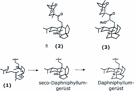 Alkaloide sind eine strukturell äußerst vielfältige Klasse von basisch (= alkalisch) reagierenden pflanzlichen Naturstoffen mit endo- oder exocyclischen Aminfunktionen, deren gemeinsame Klammer die biogenetische Herleitung aus Aminosäuren ist (plus z.T. weiterer Substanzen wie etwa Terpen-Verbindungen). So ist beispielsweise Tryptophan eine Vorstufe von Indol- und Chinolin-Alkaloiden, Tyrosin von Betacyanen und Betaxanthinen, Tyrosin + Phenylalanin von Amaryllideen-Alkaloiden und Colchicin, Ornithin von Tropan-Alkaloiden und Lysin von Chinolizidin-Alkaloiden (Hess 1979). Daphniphyllum-Alkaloide (ca. 7 Gerüsttypen, > 30 Verbindungen) leiten sich bezüglich ihres Gerüstes von Squalen (1) ab, welches zum pentacyclischen (5 Ringe) Kern von seco-Daphniphyllin (2) und weiter von Daphniphyllin (3) und anderen Gerüsttypen cyclisiert.