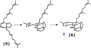 Squalen [R-C(CH3)=CH2-CH2-CH=C(CH3)-R] wird zunächst oxidativ in den 10,15 Dialdehyd [R-C(CHO)=CH2-CH2-CH=C(CHO)-R] überführt. Reaktion mit einem Amin führt zum 10-Formyl-15-imino-Derivat [R-C(CHO)=CH2-CH2-CH=C(CH=N-CH2R')-R], aus dem via prototroper Umlagerung das Azadien [R-C(CHO)=CH2-CH2-CH2-C(=C-N=CH-R')-R] entsteht; nucleophile Addition einer weiteren Aminoverbindung führt weiter zu einem Enamin [R-C(CHO)=CH2-CH2-CH2-C(=C-NH-CHNR''R')-R], welches durch nucleophilen Angriff an der 10-Formylgruppe zu Dihydropyran (4) cyclisieren kann, aus dem via säurekatalysierter Addition/Elimination ein Dihydropyridin-Derivat (5) entstehen kann. Durch eine electrocyclische Diels-Alder-Reaktionen würde sich schließlich proto-Daphniphyllin (6) bilden, das sich von natürlichem seco-Daphniphyllin u.a. durch den ungesättigten Isopropenylrest unterscheidet (vgl. die Markierung Ý bei Verbindung (6) in Abb. 2 und Verbindung (2) in Abb. 1).