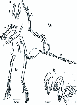 Abb. 1: Protarchaeopteryx. a Skizze des Fossils. Deutlich zu erkennen sind Arm- (A) und Beinskelett (B) sowie die Federn (B). b Detailzeichnung der Zähne. (Nach Qiang et al. 1998)