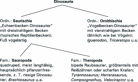 Tab. 1: Systematik der Dinosaurier. "Dinosauria" ist ein Überbegriff für die beiden Ordnungen Saurischia und Ornithischia. Die Crocodila werden wie die Pterosauria (Flugsaurier) in jeweils eigene Ordnungen gestellt. Diese Ordnungen bilden zusammen mit den Squamata (Eidechsen und Schlangen), den Chelonia (Schildkröten) und einigen anderen die Klasse der Reptilien.