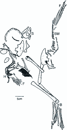 Abb. 2: Caudipteryx. Skizze des Fossils. S Schädel, SW Schwanzwirbelsäule, H Handskelett, B Beinskelett, F Federn