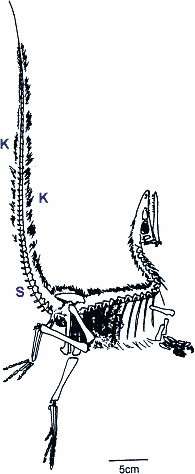 Welche neuen Erkenntnisse über die Stammesgeschichte der Vögel liefern nun diese beiden neu beschriebenen Dinosaurier? Von herausragender Bedeutung sind natürlich ihre Federn. Über die mutmaßliche Entwicklung der Federn aus Reptilienschuppen im Laufe der Evolution bringen die Funde von Protarchaeopteryx und Caudipteryx allerdings keine neuen Aufschlüssse, denn "überraschenderweise ähneln alle diese Federn denen von Vögeln" (P. Wellnhofer in der FAZ vom 8. 7. 98). Wie echte Vogelfedern besitzen sie einen Schaft (Federkiel) und davon abzweigende Federstrahlen. Die von den Strahlen gebildete Fahne der Feder ist bei Protarchaeopteryx und Caudipteryx jedoch nicht asymmetrisch, sondern symmetrisch (d.h. der Schaft liegt genau in der Mitte der Fahne). Bei allen modernen flugfähigen Vögeln sowie auch bei Archaeopteryx sind die Schwungfedern dagegen asymmetrisch. Da heutige flugunfähige Vögel, die (z.B. als Inselbewohner ohne Bodenfeinde) das Flugvermögen aufgegeben haben, symmetrische Schwungfedern besitzen, kann man dieses Merkmal als sekundär (abgeleitet) ansehen. Das heißt, symmetrische Federn sind zumindest nicht zwingend primitiver als asymmetrische (eher umgekehrt) und lassen mit einiger Wahrscheinlichkeit darauf schließen, daß Protarchaeopteryx und Caudipteryx nicht zu einem aktiven Schlagflug fähig waren.