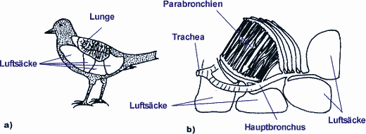 Abb. 6: Abb. 6: Atemtrakt des Vogels. a Die Lunge ist umgeben von großen Luftsäcken.b Durch die Atembewegungen treiben die Luftsäcke wie Blasebälge das Atemgas durch die Bronchien und Lungenröhren. (Nach Scheid et al. 1995)