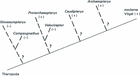 Eine stammesgeschichtliche Beziehung zwischen Archaeopteryx und den befiederten Sauriern ist nur möglich, wenn man annimmt, daß beide von bereits flugfähigen, befiederten Sauriern abstammten, die im Falle von Protarchaeopteryx und Caudipteryx ihre Flugfähigkeit wieder einbüßten, im Falle von Archaeopteryx dagegen beibehielten. Da auch Archaeopteryx schon seit einiger Zeit aufgrund spezieller Merkmale nicht als Vorfahre der modernen Vögel diskutiert wird (vgl. Junker & Scherer 1998), ist evolutionstheoretisch die nächstliegende Schlußfolgerung, sowohl die (bisher gefundenen) befiederten Saurier als auch Archaeopteryx auf einen blind endenden Seitenzweig des Vogelstammbaums zu plazieren (Abb. 7).