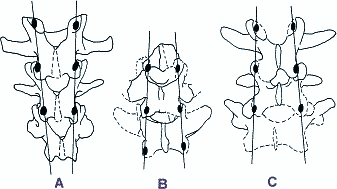 Abb. 2: Der dritte bis fünfte Lendenwirbel von (A) Schimpanse, (B) Oreopithecus bambolii und (C) Australopithecus africanus (Sts 14) in der Ansicht von hinten (nach Köhler & Moyà-Solà 1997). Verbindet man die Wirbelbogengelenksflächen mit einem durchgehenden Strich, dann bilden sie bei Oreopithecus und Australopithecus eine Pyramide. Beim Schimpansen sind die Verhältnisse umgekehrt. Das menschliche Muster von Oreopithecus weist auf eine Lendenwirbelsäulenlordose als Anpassung an eine bipede Fortbewegung hin.