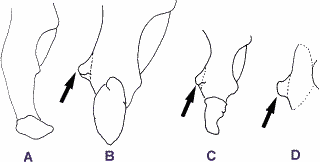 Abb. 3: Die Sitzbeinregion des Beckens von (A) Menschenaffe, (B) Mensch, (C) Australopithecus und (D) Oreopithecus (nach Meister 1997). Die Spina ischiadica (Pfeil) ist beim Menschen gut, bei den Großaffen dagegen schlecht oder gar nicht entwickelt. Dieser Knochensporn ist bei Oreopithecus gut (Köhler & Moyá-Solá 1997) und bei Australopithecus mäßiggradig ausgebildet (Abitbol 1988). Eine gut ausgebildete Spina ischiadica ist für die Abstützung der Eingeweide bei aufrechter Körperhaltung notwendig.