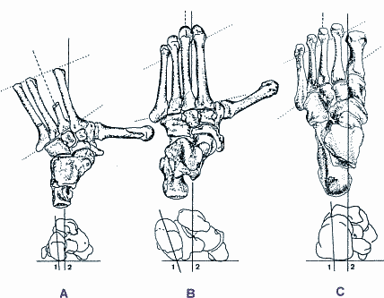 Am auffälligsten an diesem Fuß ist die nach innen verlaufende Fußhebellinie. Üblicherweise verläuft die Fußhebellinie bei den Primaten parallel zum dritten Mittelfußknochen. Bei Oreopithecus verläuft sie dagegen zwischen dem ersten und zweiten Mittelfußknochen wie beim Menschen. Im Gegensatz zum Menschen wird dieser Fußhebellinienverlauf aber durch abduzierte (abgespreizte) äußere Mittelfußknochen hervorgerufen (Abb. 4). Wenn ein Gorilla sich auf dem Erdboden bewegt, dann sind seine Mittelfußknochen ähnlich nach außen abgespreizt. Auch die geringe Größe des Würfelbeines, die großen Gelenkflächen auf dem äußeren und mittleren Keilbein und der zwischen den Keilbeinen und dem dritten Mittelfußknochen verankerte zweite Mittelfußknochen weisen auf eine hohe Kraftübertragung im Innenbereich des Fußes hin. Die Mittelfußknochen sind kurz, nur gering gekrümmt, und ihre Länge nimmt nach innen zu ab. Zusammen mit dem nach innen verlaufenden Fußhebel hat das zur Folge, daß während der Fortbewegung auf zwei Beinen nur geringe Scherkräfte im Mittelfußbereich auftreten. Außerdem ist damit das Abstützgebiet des Fußes für die Ausbalancierung des Körperschwerpunktes beim zweibeinigen Stehen und Gehen sehr groß.