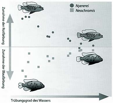 Seehausen et al. (1997) haben die Artenvielfalt und die Farbenpracht der Buntbarsche an verschiedenen stark eutrophierten Stellen des Viktoriasees untersucht. Es zeigte sich, daß die Intensität der Färbung der Fische mit abnehmender Lichtdurchlässigkeit des Wassers abnimmt (Abb. 1). Die roten Männchen sind dann weniger rot und die blauen weniger blau. Dies hängt wahrscheinlich damit zusammen, daß die Weibchen die Farben ihrer Männchen nicht mehr gut genug sehen können, wenn das Wasser trüber wird. Dadurch kommt es vermehrt zu Paarungen mit einem Männchen der "falschen" Art und der Selektionsdruck auf ausgeprägte Färbung fällt weg. Das Endresultat ist eine dramatische Abnahme der Artenvielfalt in solcherart verschmutzten Gewässern innerhalb von wenigen Jahren.