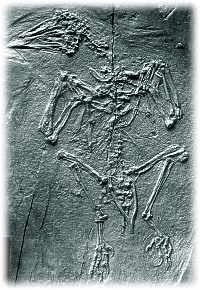 Abb. 1: Eine Platte mit dem Skelett eines Vogels aus der Unterkreide Chinas. Um die Einzelheiten besser hervortreten zu lassen, wurde sie mit Ammoniumchlorid beschichtet. Dabei werden allerdings die Federreste verdeckt. Maßstab: 4 cm. (Aus Peters 1996, Abdruck mit freundlicher Genehmigung des Autors und des Verlags)