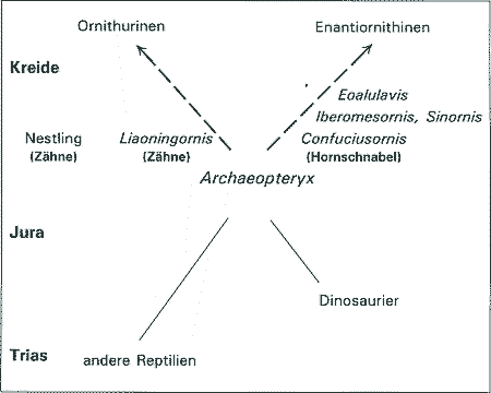 Diese und andere Funde belegen, daß in der Unterkreide der Fächer der verschiedenen Baupläne bei Vögeln bereits so groß war, daß Archaeopteryx als Vorfahr nicht in Frage kommt. Nach Peters (1997b) und Gibbons (1996) muß es mindestens zwei unabhängige Entwicklungslinien gegeben haben. Allgemein stellt sich mittlerweile die frühe Vogelevolution als ein Nebeneinander vieler verschiedener Baupläne und verschiedenster mosaikartiger Merkmalskombinationen dar, die eine phylogenetische Rekonstruktion erheblich erschweren (vgl. Abb. 4). Beispielsweise hätte man nicht vermutet, daß eine Flügelkonstruktion, wie sie in den Senckenberg-Exemplaren vorliegt, in Kombination mit einem so "altertümlichen" Becken beim selben Tier auftreten könnte. Wären die Knochen einzeln und nicht im Verband gefunden worden, man hätte sie wohl nicht für Teile ein und desselben Tieres gehalten. Womöglich muß man sich auch von vielen Vorstellungen verabschieden, was "typische Vogelmerkmale" sind: Beispielsweise taucht ein Hornschnabel offenbar in verschiedenen Vogellinien unabhängig auf und kommt darüber hinaus auch bei Schildkröten und Flugsauriern vor. Nicht einmal Federn scheinen allein für Vögel typisch zu sein, wie der Fund eines Dinosauriers mit Rückenbefiederung zu zeigen scheint (vgl. Shipman 1997).