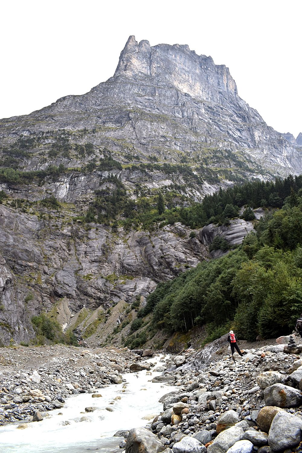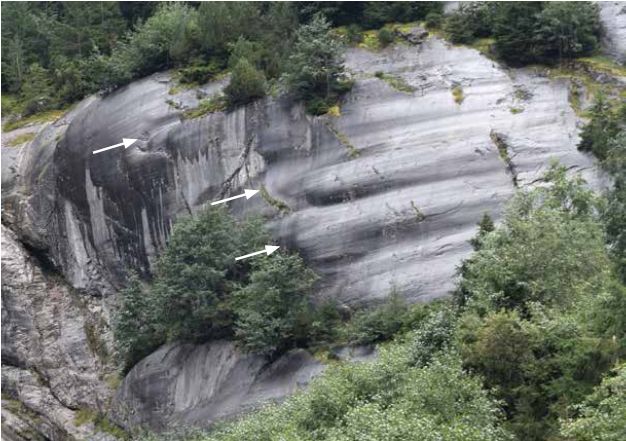 Figure 2. Abb. 2 Nordwand des Mättenbergs bei Grindelwald, Schweiz. Der Bach im Vordergrund, die Schwarze Lütschine, wird hauptsächlich vom Oberen Grindelwaldgletscher gespeist, der Mitte des 19. Jahrhunderts noch über diesen Talabschnitt und weiter floss. Rechts der Mitte ist die Stelle der markanten Oberfläche zu sehen, die in Abb. 1 vergrößert dargestellt ist. Foto: M. Kotulla, 2021.