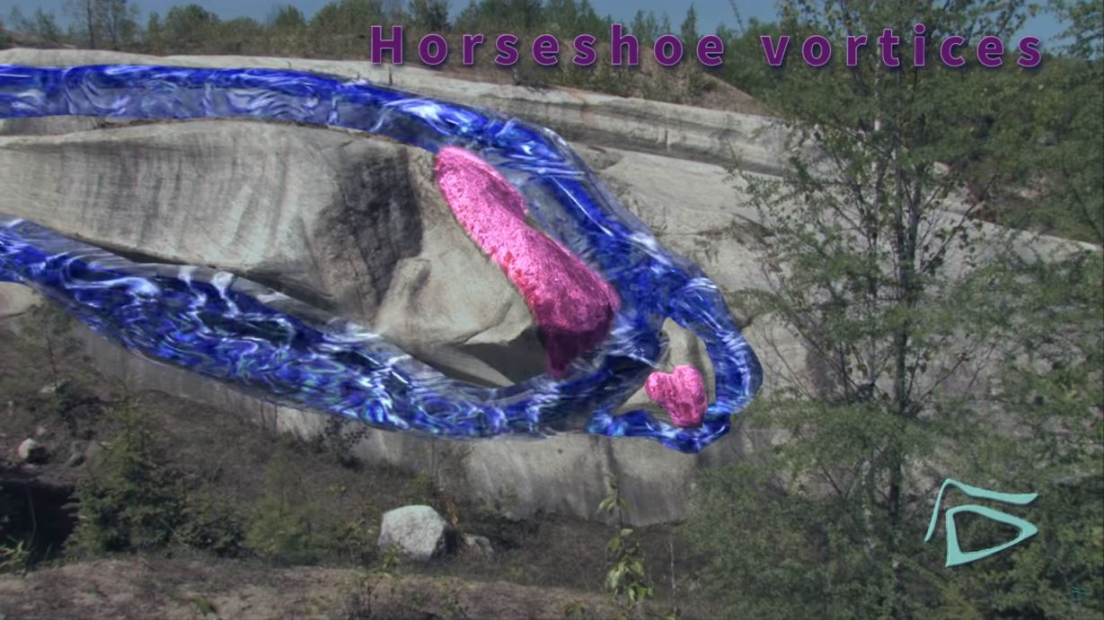 Figure 3. Abb. 3 Skulpturierte Form (S-Form). Visualisierung der Strömung, von rechts nach links: Hufeisenwirbel (horseshoe vortices). „Die skulpturierten Felsen von Cantley“, Quebec. Video-Screenshot (© Geodoxa).